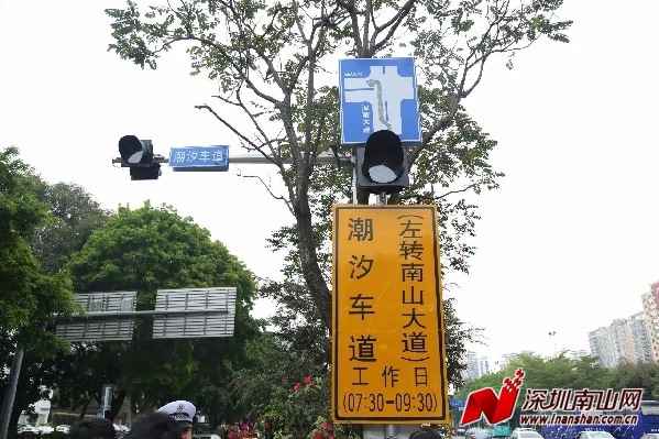 目前,深南大道南新路至南山大道路段(长约350米)东往西最内侧一条车道设置为潮汐车道。工作日每天7时30分至9时30分,潮汐车道禁止机动车由东往西方向行驶,准许机动车由西往东方向行驶;其余时段,潮汐车道允许机动车由东往西方向行驶。同时,西往东方向左侧第二条左转车道设置为可变车道车道,潮汐车道使用时,可变车道设置为直行车道,从而增加断面直行的通行能力。潮汐车道关闭时,可变车道恢复为左转车道。