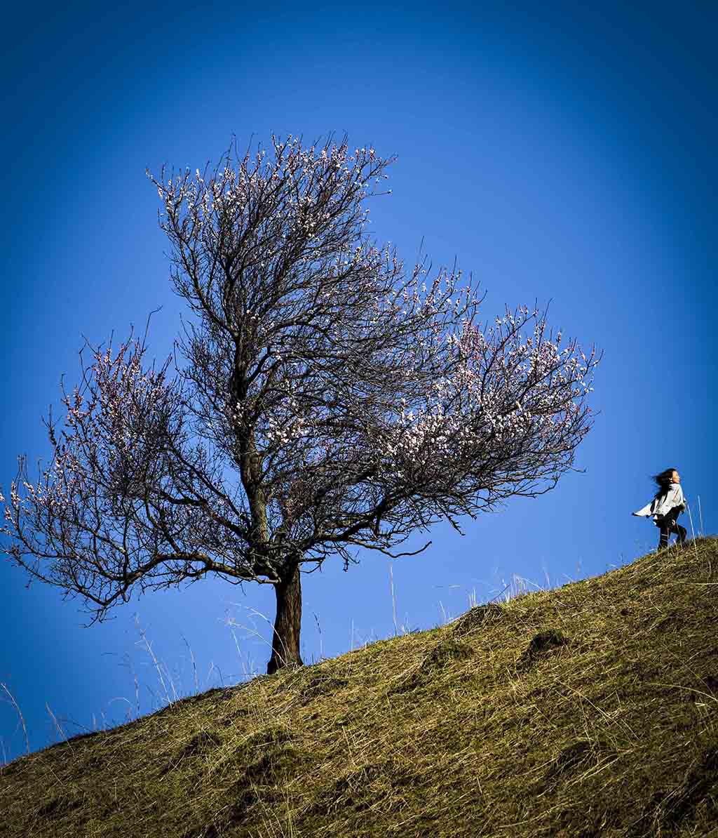 ↑一名游客在一棵杏树下拍照(4月15日摄)。