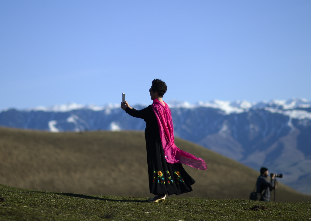 ↑游客在杏花沟的一处山头上游玩拍照(4月15日摄)。