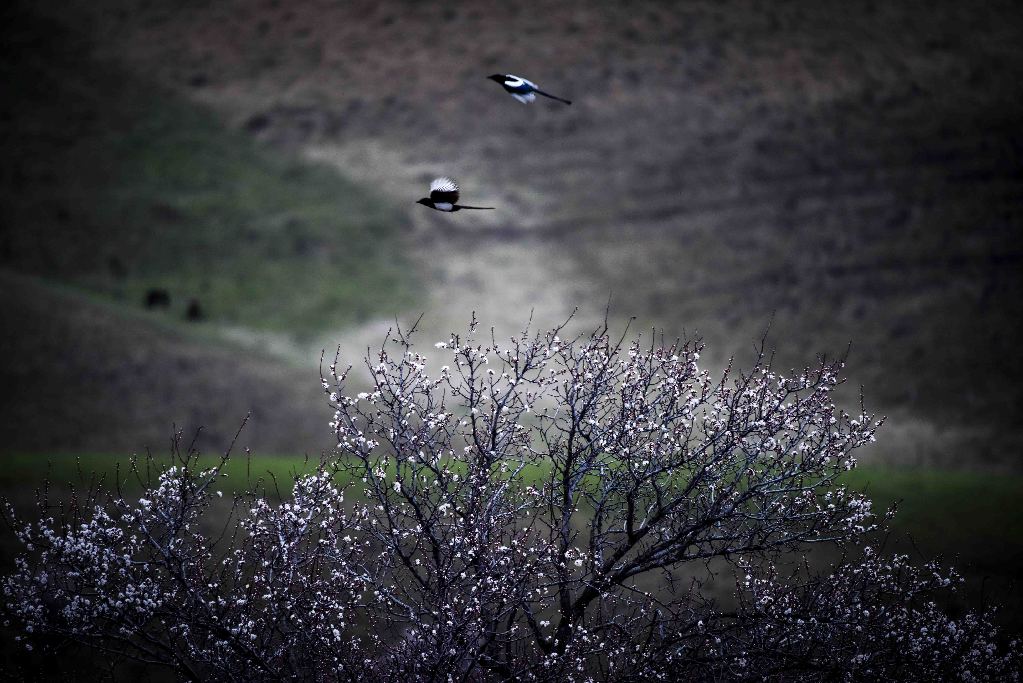 ↑两只喜鹊从杏花沟绽放的杏树上飞过(4月16日摄)。