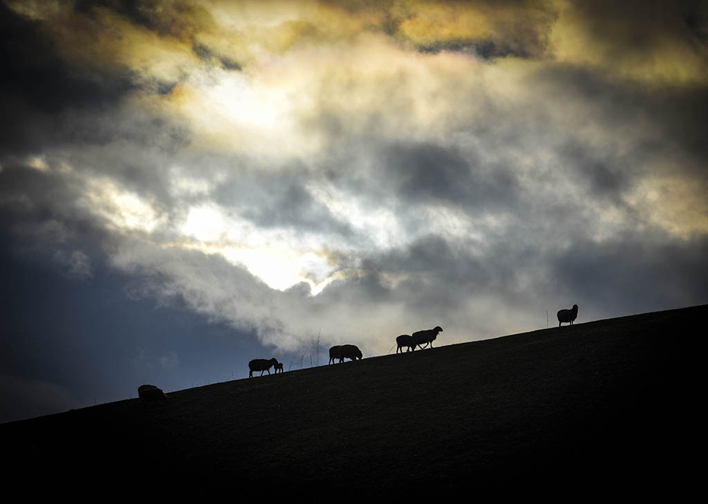 ↑杏花沟的山脊上的几只羊在觅食(4月14日)。
