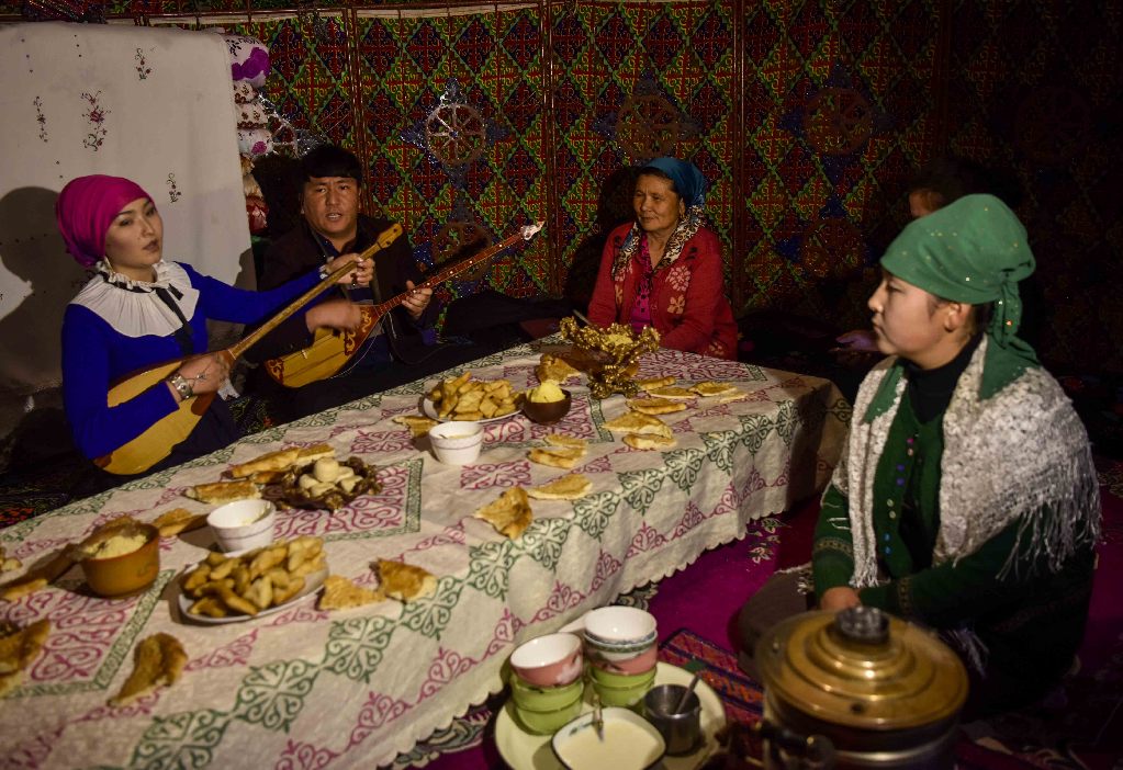 ↑在吐尔根乡牧民吐尔丁家,当地牧民在进行阿肯弹唱(4月14日摄)。