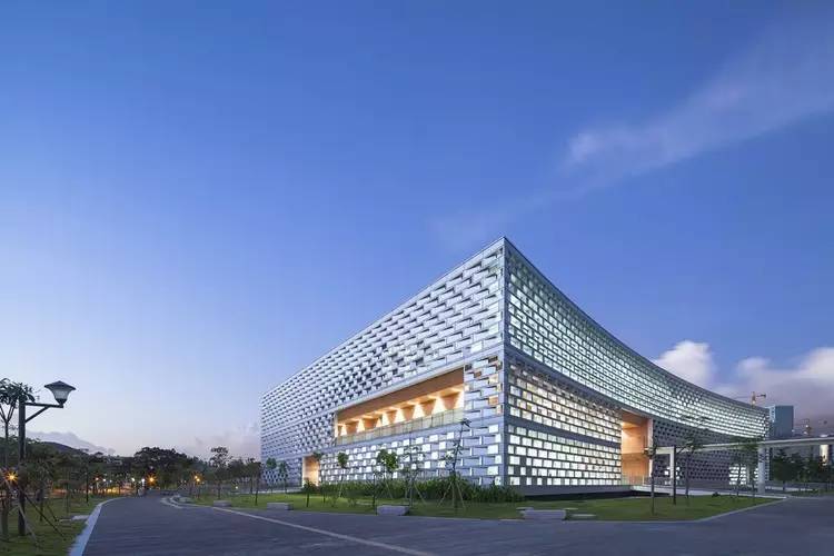 南方科技大学图书馆在建筑轮廓处理上采用了内凹的弧形,跟外部环境形成一种包裹的关系,形成建筑外向,非物体性的姿态。图书馆内部空间的设计使建筑功能根据十字交通系统自然的分离开。