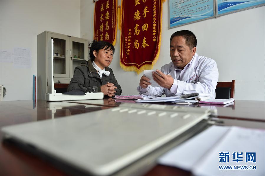 4月19日,在山西省平顺县苗庄镇卫生院,崔成斌为一名病人开药。新华社记者詹彦摄