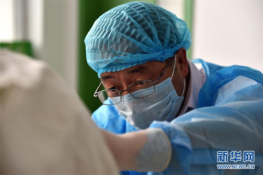 4月19日,在山西省平顺县苗庄镇卫生院,崔成斌为一名病人做检查。新华社记者詹彦摄