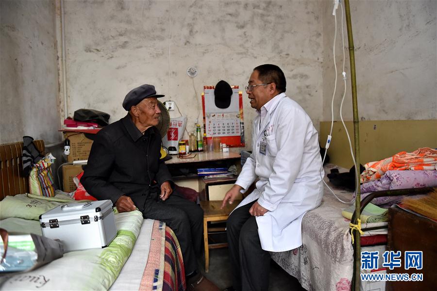 4月19日,在山西省平顺县苗庄镇北甘泉村,崔成斌上门为一位老人做检查。新华社记者詹彦摄