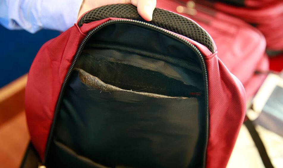 据了解,疑犯把冰毒打包好后装入书包的夹层,再用针线把剪开的口子缝好。办案民警介绍,疑犯在打包好的冰毒外层,再用复写纸和锡纸包裹,企图躲过X光机检测,“其实这些都是徒劳的,完全躲不过。”图为用来装毒品的书包。