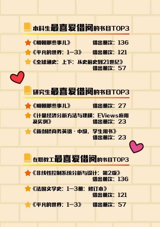 虽然个人借阅榜单上研究生略少于本科生,但研究生的人均借阅量10.6册几乎是本科生的2倍!研究生们学习的知识更为专业系统,没有大量理论知识的支撑是不行的。因此研究生们的平均借阅量要多于本科生也不足为奇啦。