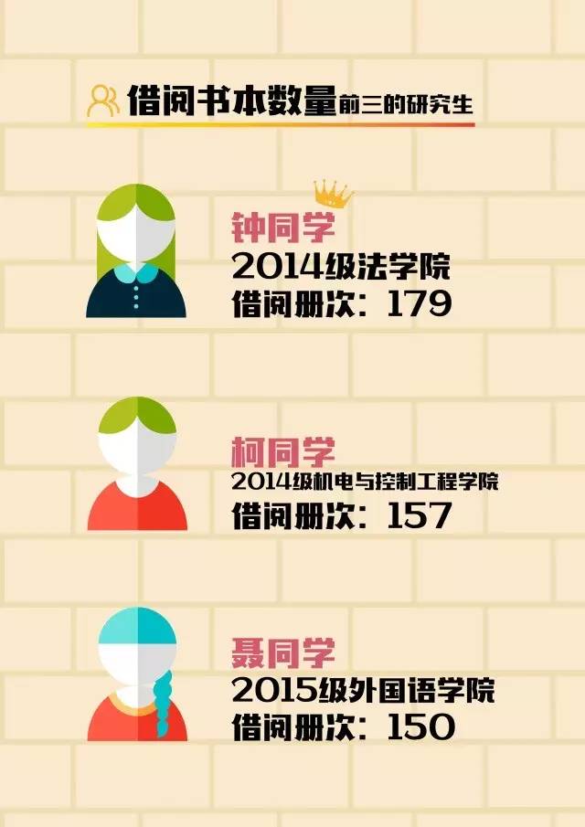 研究生借阅数量也十分惊人。不过榜首钟同学的借阅量还是小于本科生榜首吴同学噢。