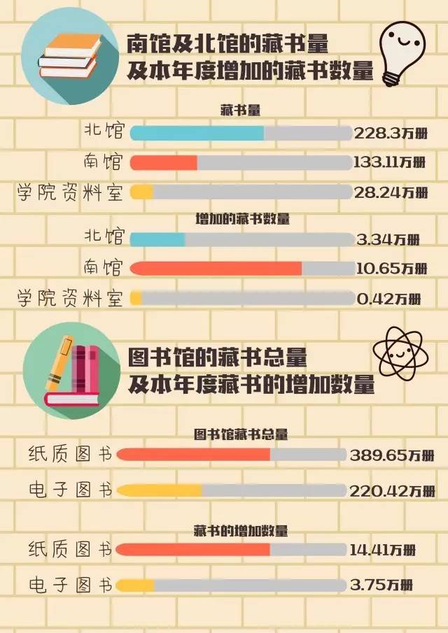 北馆毕竟更早落成,藏书量几乎是南馆的两倍。但在2016年,南馆奋起直追,新增加的图书接近北馆增加书目的3倍!让我们一起期待南北馆的藏书什么时候能够“势均力敌”吧!