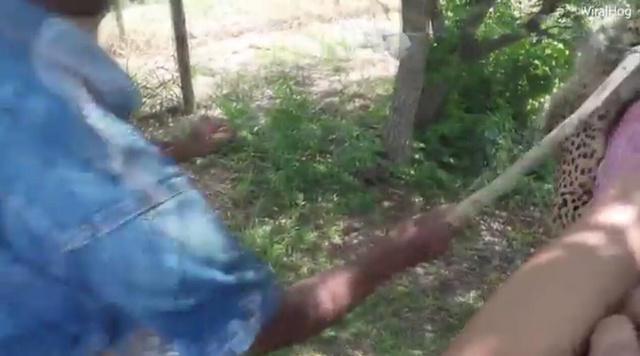 猎豹依然扑在她身上不依不饶,试图再次下嘴。旁边一名穿蓝色上衣的男子拿着棍子冲上去试图赶走猎豹,旁边的游客也纷纷出手帮忙。图为蓝色衣服的男子冲上去试图赶走猎豹。