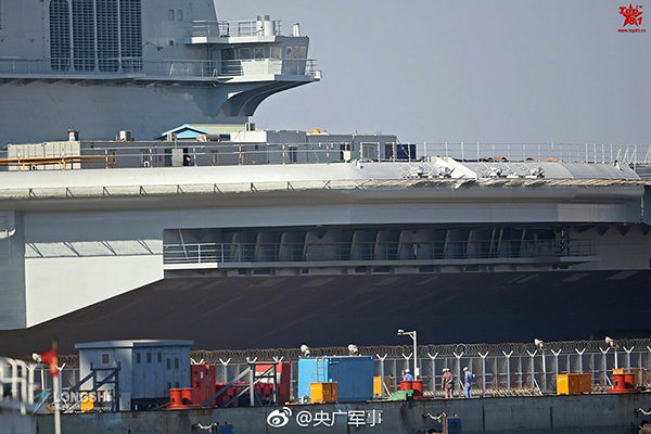 网友陆续曝光的照片还显示,舰岛上的玻璃窗和四面相控阵雷达已在建设中,疑似提前进行了下水后的舾装环节?媒体纷纷猜测,已经具备下水条件的国产航母可能在等待4月23日海军节下水。