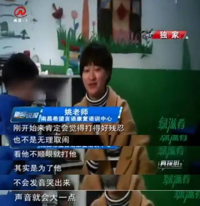南昌广播电视台记者接到爆料人举报后,到这家康复中心卧底十几天,发现多名幼儿园老师对孩子有虐待行为,除了上述的打骂孩子等暴力行为之外,甚至还有老师威胁孩子“吃屎”、教孩子骂人等现象,而被打的孩子只能发出“啊啊啊啊”的哭声……