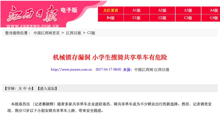 据江西日报4月17日报道,据悉,ofo单车机械锁存有漏洞。ofo“小黄车”使用简单的4位数字密码机械锁,每个车牌号对应的机械锁密码是固定的,只要记住对应车牌号码的密码就能开锁。此外,机械锁不具备GPS模块,这使企业对车辆的监控、管理、调度更困难,安全性更难保证。