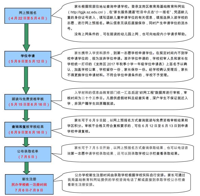 8、网上预报名填报的《龙岗区2017年秋季小学一年级学位申请表》由学校统一打印。请家长记住网上预报名保存后的学位申请流水号,以便学位申请时核对。