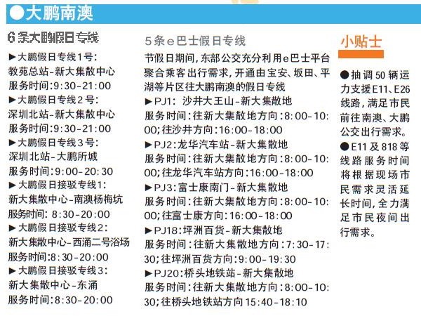 深圳新闻网讯 今年五一假期预计深圳各景区、口岸、商圈公交出行需求剧增,交通部门呼吁市民尽量少开车,选择绿色出行方式。晶报记者收集最实用的假期公交出行资讯,推出玩转假期公交出行攻略。东部公交负责人表示,该企业已经制定了周密的五一假日公交保障方案,建议市民优先选择假日专线外出游玩。