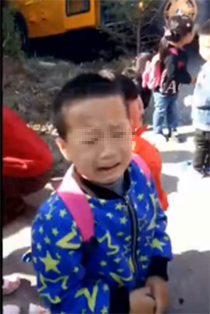 图为26日下午,大连瓦房店红沿河镇车祸现场,一名幼儿园学生哭泣。