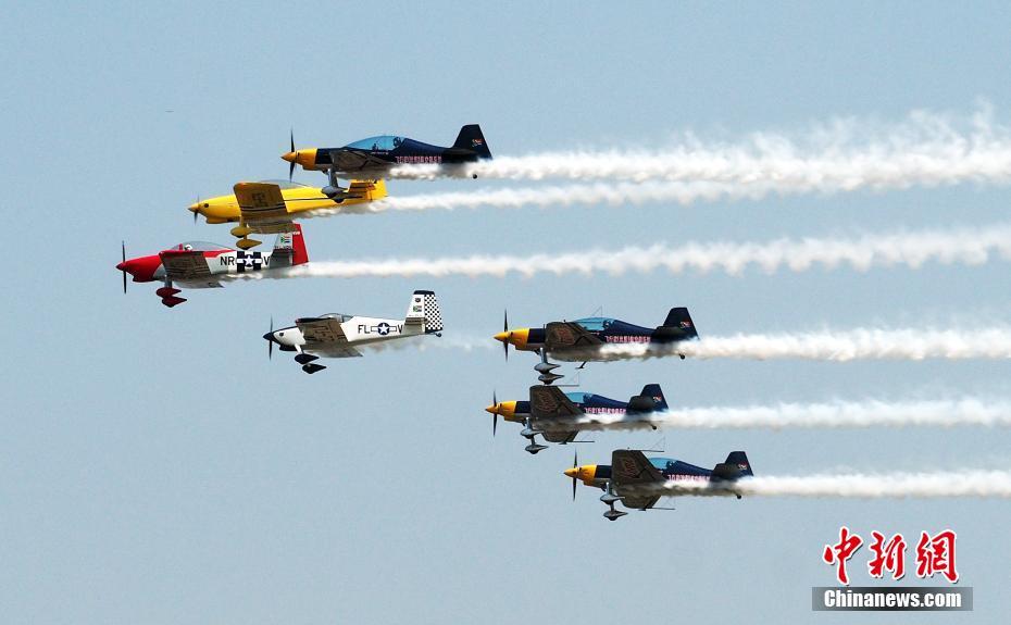 4月27日,2017郑州航展在河南郑州上街机场开幕,南非速龙特技表演队进行飞行表演。从世界各国40多支特技飞行队遴选的14支顶级飞行队,上演了一场场别开生面的空中特技秀。中新社记者毛建军 摄