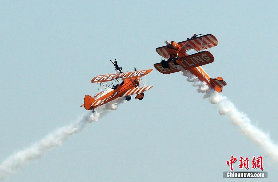 4月27日,2017郑州航展在河南郑州上街机场开幕,百年灵空中漫步飞行表演队进行表演。从世界各国40多支特技飞行队遴选的14支顶级飞行队,上演了一场场别开生面的空中特技秀。中新社记者毛建军 摄