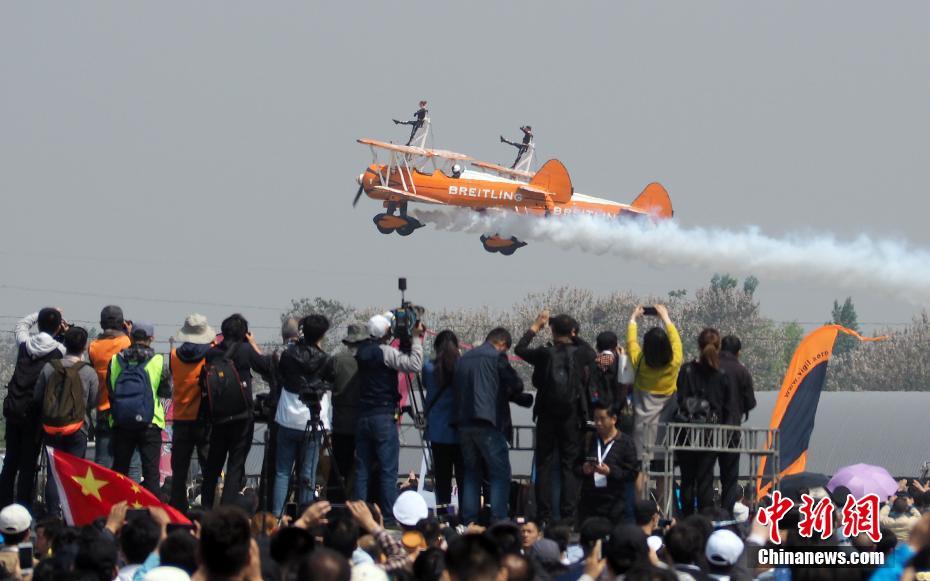 4月27日,2017郑州航展在河南郑州上街机场开幕,百年灵空中漫步飞行表演队进行表演。从世界各国40多支特技飞行队遴选的14支顶级飞行队,上演了一场场别开生面的空中特技秀。中新社记者毛建军 摄