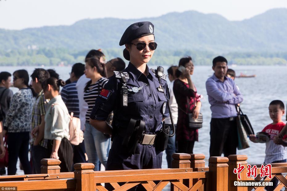 2017年4月29日,五一小长假首日,杭州西湖景区断桥景点,游人比肩接踵,只见人头不见桥头。从上午开始,杭州西湖景区就进入了游客“高峰模式”。清一色的贝雷帽、墨镜、蓝牙耳机、执法记录仪……断桥上,身着统一制服的美女城管成为人海中的一道风景。林安 摄 图片来源:视觉中国