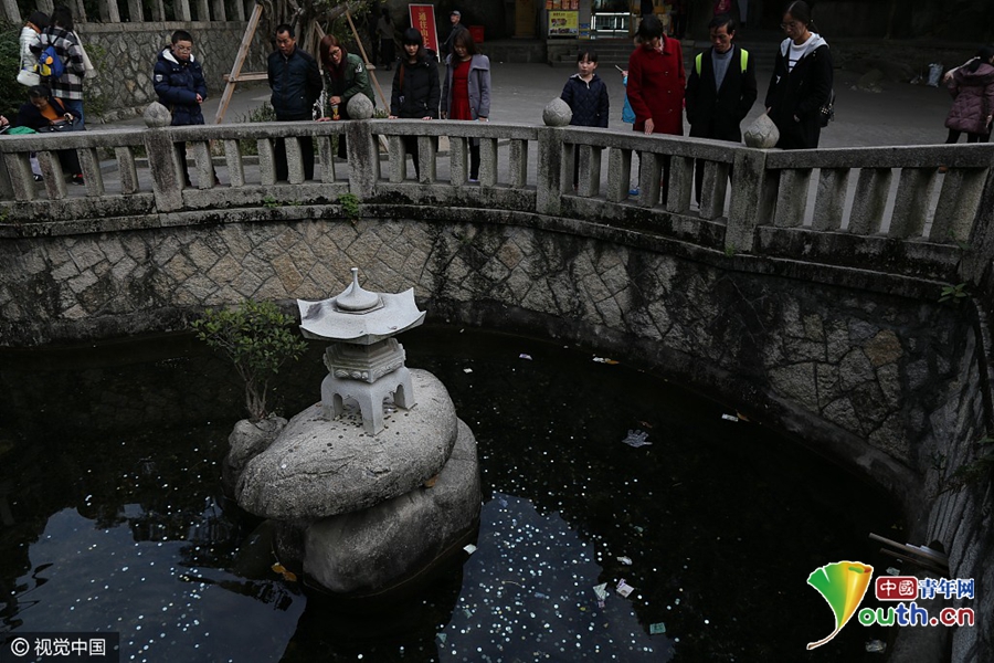 2017年2月10日,福建厦门,南普陀寺内的“洗心池”等多处水池旁,不少游客向池内的石制笼箱扔钱,大量硬币、纸币落在水池内。
