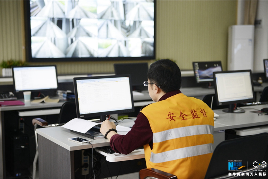 在武汉铁路局武汉桥工段里,有一座建成不久,刚投入使用的现代化“作战指挥部”。整个大厅窗明几净,一张巨幅电子屏幕悬挂在大厅正前方,屏幕内显示着大桥数十处关键处所摄像头所摄录到的画面。大厅中央分2排摆放着10台电脑,从电脑上可以直接看到大桥的各项日常检测数据,实现从纯手工作业到大数据运用的“大穿越”。新华网欧阳小洁摄