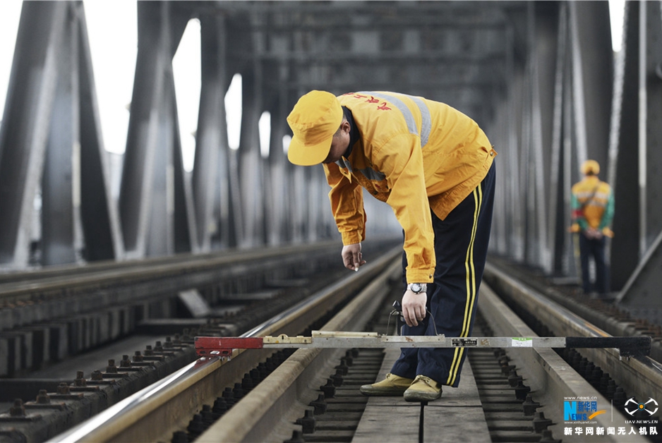 现在,有了电动机械设备以后,形成了流水线作业,一人在前面松扣件,一人紧跟在后面保养涂油并复紧,平均下来,每人每个小时就能保养20多根轨枕,作业效率大大提高。新华网欧阳小洁摄