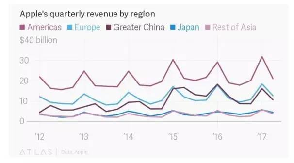 ▲中国市场曾短暂超越欧洲市场,成为苹果仅次于美国的第二大市场