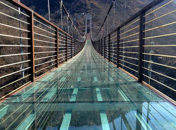 清远牛鱼嘴玻璃吊桥建于牛鱼嘴风景区的悬崖上,由铁索块巨透明玻璃搭建而成,于今年3月15日全线贯通。它全长250米,悬空桥身长达200米,离地高度超过200米,站在桥上仿佛悬浮于空中,“一不小心就会跌入深渊”的错觉给人惊吓,但桥下郁郁葱葱的丛林美景又让人惊叹不已。当然啦,担心自己恐高的小伙伴们还是要三思而后行啦~