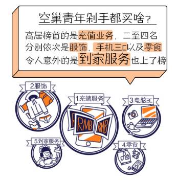而每晚21-22点,是他们买买买的高峰。除了充值业务、服饰、手机3C,他们最喜欢购买的还有各种零食和预约到家服务。都说宅男费纸,宅女费电,谁能想到“空巢青年”最费的竟然是话费和流量啊!
