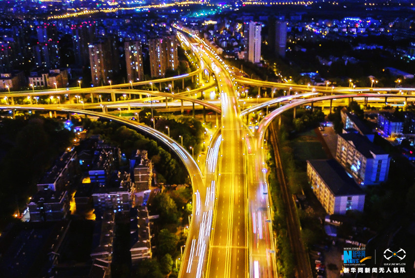 夜幕降临,华灯初上,南京卡子门立交桥如闪亮的光影“演奏会”。新华网发(席航飞 唐杨摄)