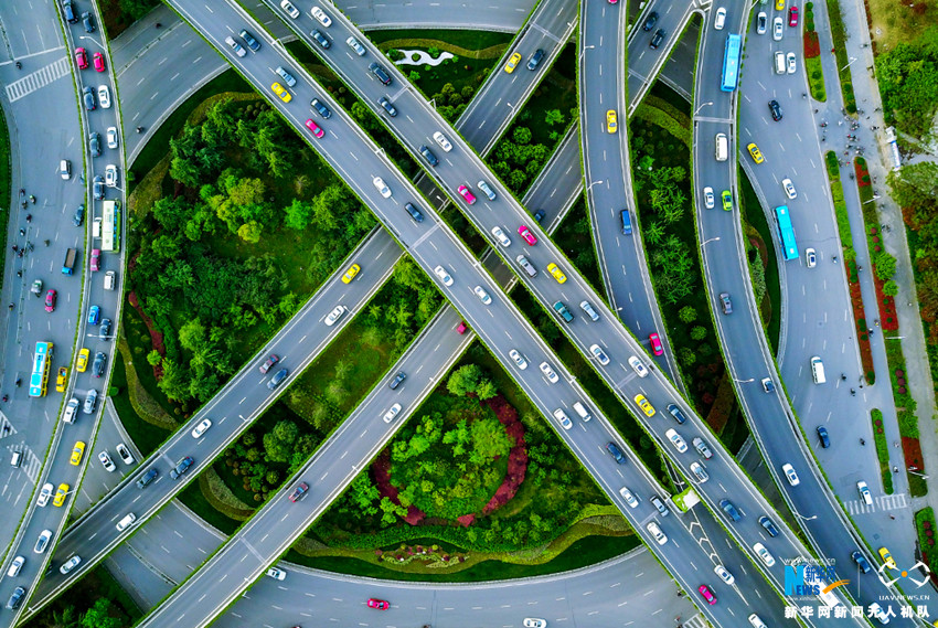 穿行的车辆点缀着纵横交错的立交桥。新华网发(席航飞 唐杨摄)