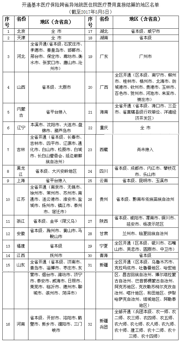 2016年12月,人社部、财政部联合印发《关于做好基本医疗保险跨省异地就医住院医疗费用直接结算工作的通知》(人社部发〔2016〕120号),12月15日国家基本医疗保险异地就医结算系统正式上线试运行。截至2017年5月5日,除西藏外,全国各省份均整体或部分接入国家基本医疗保险异地就医结算系统,开通160个地区和1008家跨省异地就医住院医疗费用直接结算定点医疗机构,现予发布。