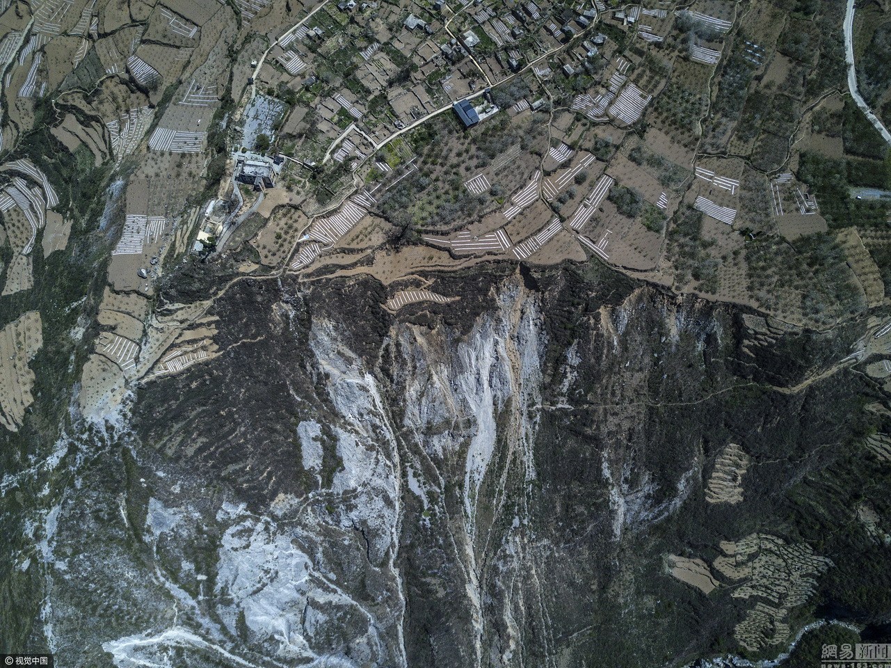 汶川县萝卜寨在地震中完全损毁,靠近悬崖的山体还可见到地震时的遗迹,援建的新寨子搬到了更高的山坡。