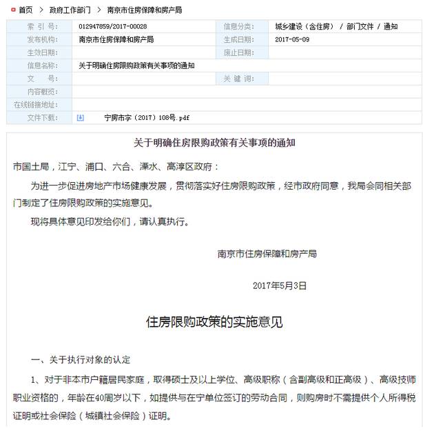 5月9日,南京市住房保障和房产局官网发布《关于明确住房限购政策有关事项的通知》(以下简称《通知》),其中明确,对于非南京市户籍居民家庭,凡是取得硕士及以上学位、高级职称(含副高级和正高级)、高级技师职业资格的,年龄在40周岁以下,如提供与在宁单位签订的劳动合同,在江宁、浦口、六合、溧水和高淳五个区购房则不需要提供社保证明。