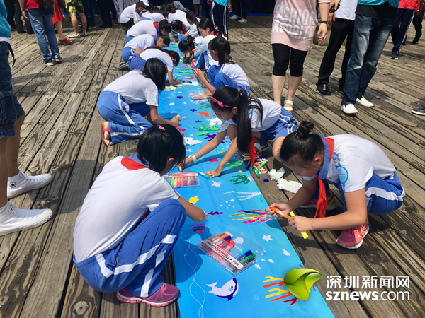 记者在现场看到,活动现场还设置了“山海梅沙 美好城区”书法.长城砖刻作品展及珊瑚展,引来不少市民驻足观赏。在沙滩上,来自梅沙小学的50名学生用手中的画笔,共同绘出他们心中美丽的海洋。