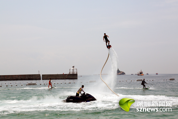 在表演环节,中国国家摩托艇队、盐田区帆板队、香港动力冲浪板队进行了精彩的水上运动表演。在中国国家摩托艇队队长巫荣华的带领下,“海上骑士”们在无边的大海上,尽情享受风驰电掣的刺激;另一边,来自中国香港的动力冲浪板队,利用冲浪板在浪花间展现另一种不同风格的酣畅淋漓;现场最吸人眼球的要数“水上飞人”表演,作为一个高技能水上极限运动,水上飞行讲究的是高难度的身体平衡性和协调性,表演者在翻转飞跃间,将这一无比酷炫的水上运动全然呈现在现场观众面前。