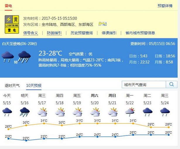 展望17日起转多云为主天气,中午前后天气较热,午后局地有短时阵雨。