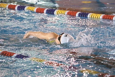 下午2点半,考试正式开始,考场秩序井然,工作人员安排学生检录,进入候考区。当学生来到游泳馆的备考区时则需要指纹验证签到方可进入考场参加考试。考场多方位安排救生员、流动救生员、医务救护等,确保考生在考试期间的急救及医疗救护保障工作。考试所用的泳池共7条泳道,水深1.2米~1.8米,全程50米,考生按组进行考试,每组7人。裁判长一发令,只见考生们采取不同泳姿开始前进,有的是自由式,有的是蛙式。尽管速度不同,但考生们还是不停拨水、蹬腿,按照自己的节奏完成全程。现场,考生就可以得知考试成绩。