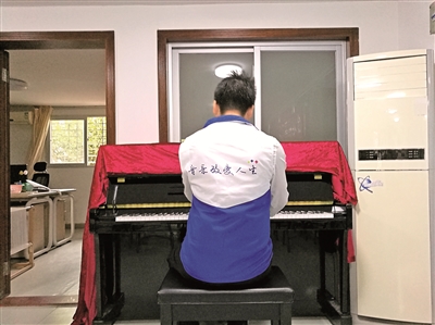 “音乐改变人生”,龚乐正穿着自己设计的义工服演奏钢琴。 深圳晚报记者 余瑶 摄