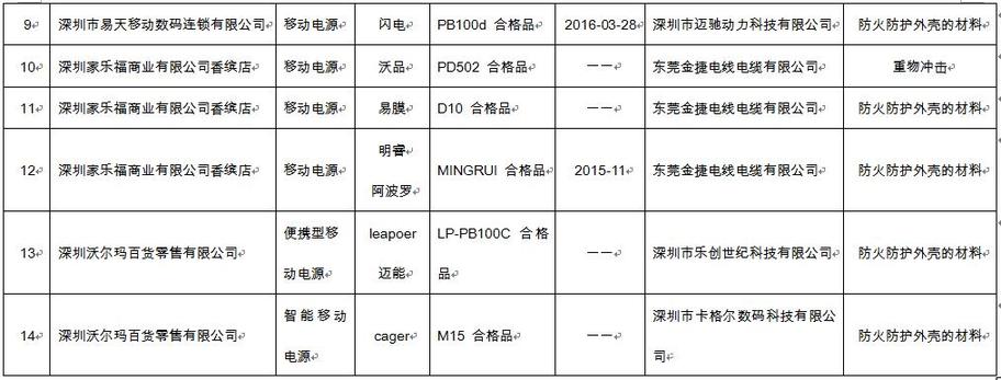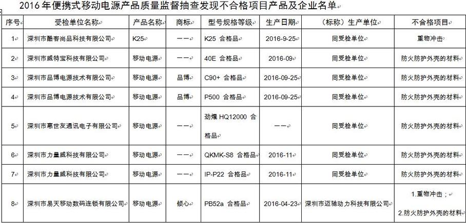 以下是十批次不合格便携式移动电源产品名单。