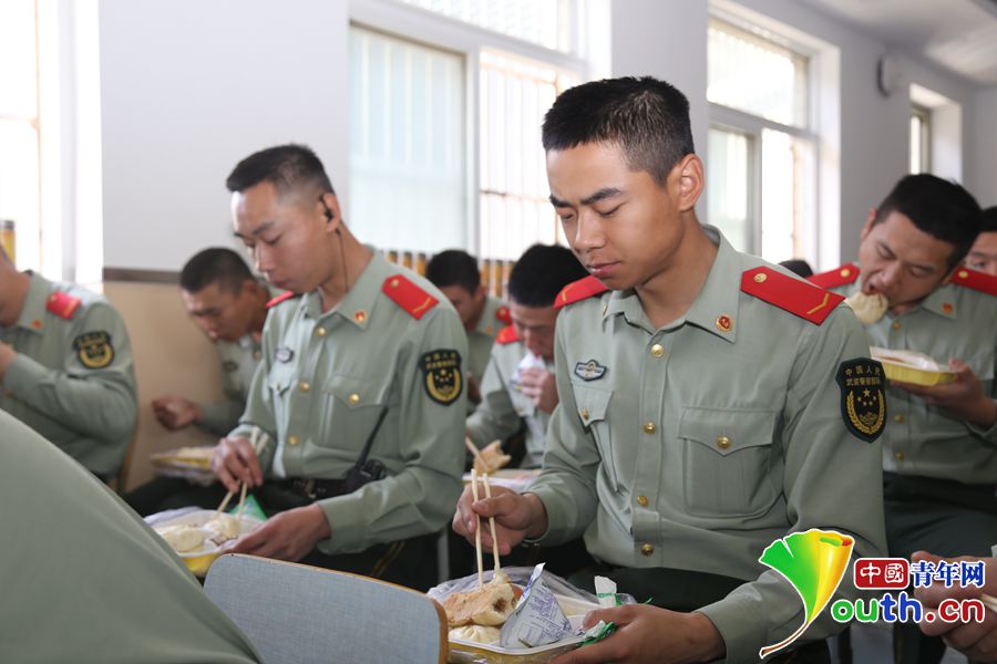 中午11时30分,哨兵们在休息点吃过简单午餐就要去哨位替换战友,继续执勤。中国青年网通讯员 姜润邈 摄
