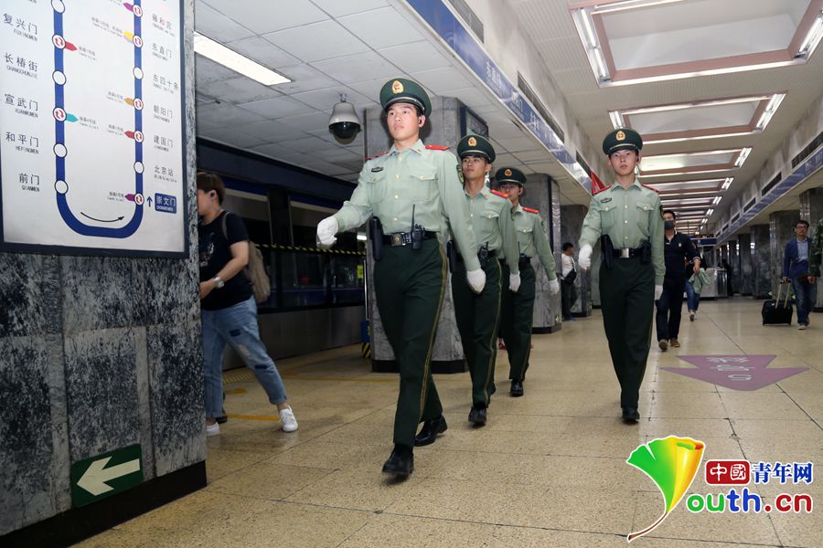 20:30武警战士们结束了一天的任务,列队整齐地从地下站台出站。中国青年网通讯员 姜润邈 摄