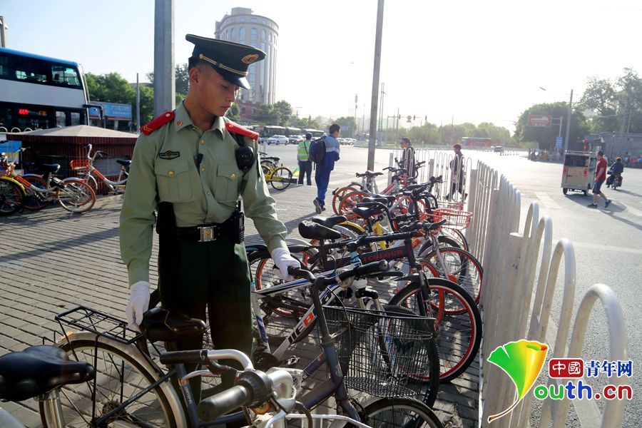 早上8时20分,下哨的执勤哨兵将进站口乱放的自行车摆放的井然有序。中国青年网通讯员 姜润邈 摄