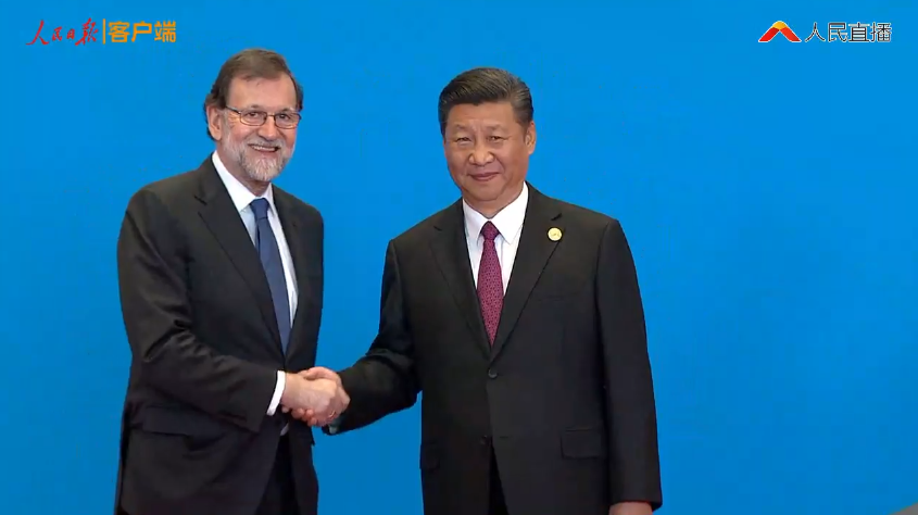 图为圆桌峰会迎宾仪式上,习近平迎接西班牙首相拉霍伊。