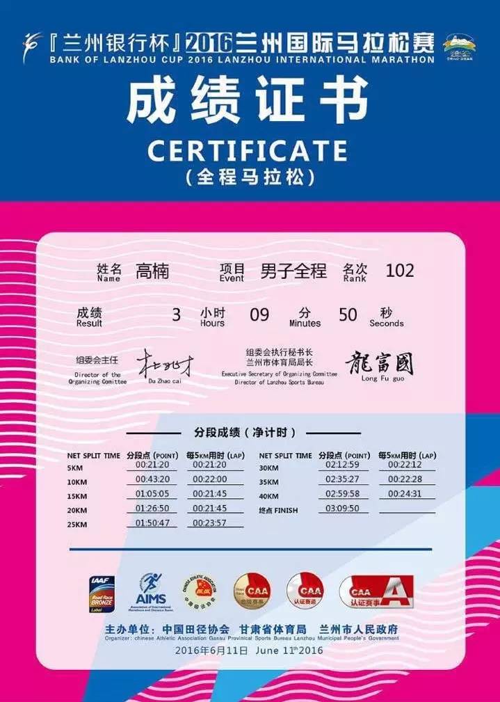 2015年9月份,高楠在北京马拉松“一雪前耻”,跑出了3小时42分的成绩!