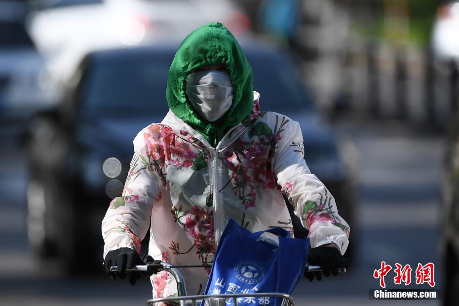 5月17日,山西太原,民众在烈日下“全副武装”出行。据中央气象台消息,17日-19日,北方多地将遭遇今年以来首次大范围高温天气,涉及京津冀、内蒙古等7省市区,其中18日高温范围最广、强度最大,内蒙古东部偏南地区局地更有可能出现38-40℃的最高气温。武俊杰摄