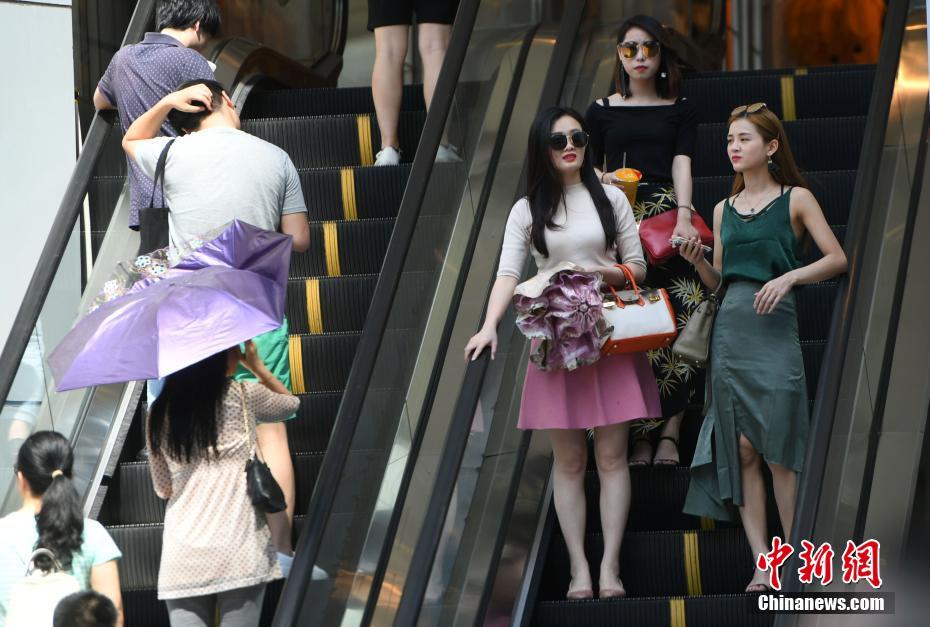 5月17日,观音桥步行街上美女着凉装出行。据中央气象台消息,17日-19日,北方多地将遭遇今年以来首次大范围高温天气,涉及京津冀、内蒙古等7省市区,其中18日高温范围最广、强度最大,内蒙古东部偏南地区局地更有可能出现38-40℃的最高气温。中新社记者陈超 摄