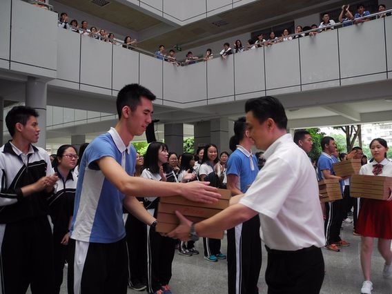 与严肃的壮行仪式不同,整个活动充满掌声与笑声。最让学生们开心的是,校长为高三学子们送上由学校老师在食堂里亲手烹制的“必胜饼”披萨,祝福学生们高考“必胜”,取得优异的成绩,考上理想的大学。鲁江还向高三考生透露,高考期间,学校食堂还将为考生们免费送上鸡翅,寓意大家能“飞得更高”。鲁江告诉记者,希望通过这种充满“正能量”的形式,让学生们用积极、阳光的心态看待高考。